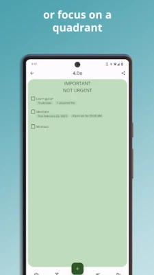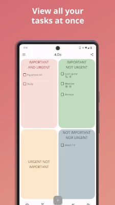 Gerencie seus projetos com precisão cirúrgica graças aos recursos intuitivos de 4.Do. Quebre grandes desafios em etapas menores e gerenciáveis com as subtarefas, adicione anexos visuais para manter tudo organizado e configure lembretes flexíveis para garantir que nenhum prazo seja perdido. Navegue sem esforço entre uma visão geral de todas as suas obrigações ou foque na matriz de prioridades, adaptando a interface para refletir seu estilo pessoal e mantendo sempre o controle.