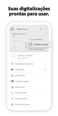 Potencialize sua experiência com recursos avançados. O Adobe Scan não só permite transformar fotos da sua biblioteca em documentos PDF, como também oferece a opção de combinar digitalizações em um único arquivo e expandir a capacidade do OCR para centenas de páginas, tornando o texto de documentos extensos totalmente pesquisável. Com a confiança de milhões em todo o mundo, ele se estabelece como a solução definitiva para converter documentos e imagens importantes em formatos digitais versáteis, prontos para serem exportados para Word, Excel ou PowerPoint e compartilhados com facilidade.