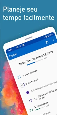 Meu Agenda Diário: tarefas é seu planejador essencial para organizar o dia. Inclui calendário, lembretes, listas de afazeres e acompanhamento de progresso. Gerencie tarefas com subtarefas e pastas, mesmo offline, para maior produtividade diária.