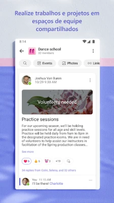 Para ir além da comunicação e realmente realizar projetos em conjunto, o Microsoft Teams Gratuito oferece ferramentas robustas. Compartilhe fotos e vídeos sem esforço para manter todos atualizados sobre os momentos importantes. Acesse documentos e arquivos essenciais de qualquer lugar com o armazenamento na nuvem. Mantenha tudo organizado dentro de comunidades dedicadas, centralizando eventos, mídias e links para que você nunca perca tempo procurando. Maximize a eficácia de suas reuniões com recursos como o compartilhamento de tela, o uso de quadro de comunicações interativo e sessões de grupo em salas virtuais. Gerencie o fluxo de informações com precisão, garantindo que as pessoas certas tenham acesso ao que precisam, e use listas de tarefas intuitivas para atribuir, acompanhar e finalizar projetos de maneira colaborativa.