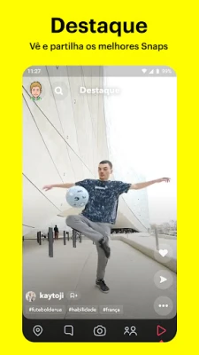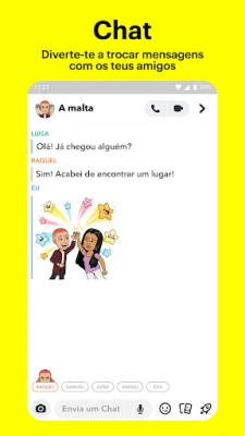 Explore um mundo de entretenimento e inspiração com as Histórias dos seus amigos, acompanhando o quotidiano deles de forma envolvente. Mergulhe nas Histórias da comunidade do Snapchat, personalizadas aos seus interesses, e mantenha-se a par das últimas notícias ou desfrute de programas originais e exclusivos que só encontra aqui. O Destaque é o seu palco para o melhor do Snapchat, onde pode enviar os seus próprios Snaps para o mundo ou simplesmente relaxar e descobrir conteúdos fascinantes, escolhendo os seus favoritos para partilhar. Guarde todas as suas memórias preciosas em Memórias, um arquivo ilimitado de fotos e vídeos, que pode reeditar, enviar a amigos ou usar para criar novas Histórias. Cada amizade ganha vida nos Perfis de Amizade, um espaço exclusivo para rever momentos partilhados e descobrir coisas novas em comum, desde a vossa compatibilidade astrológica até ao estilo dos vossos Bitmoji, fortalecendo aquilo que torna a vossa amizade tão especial.